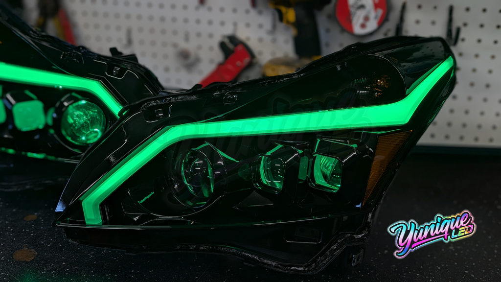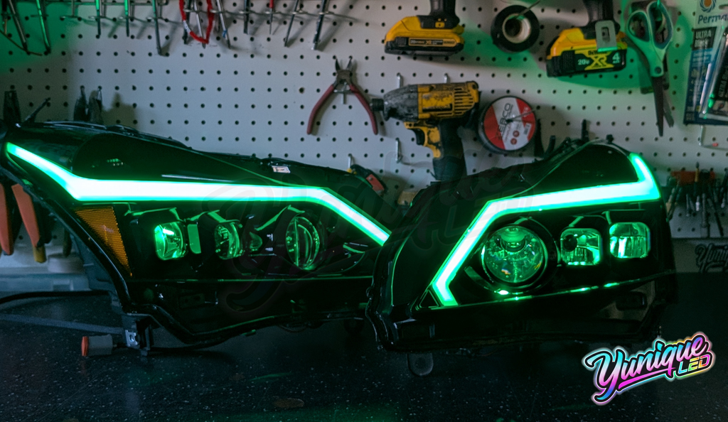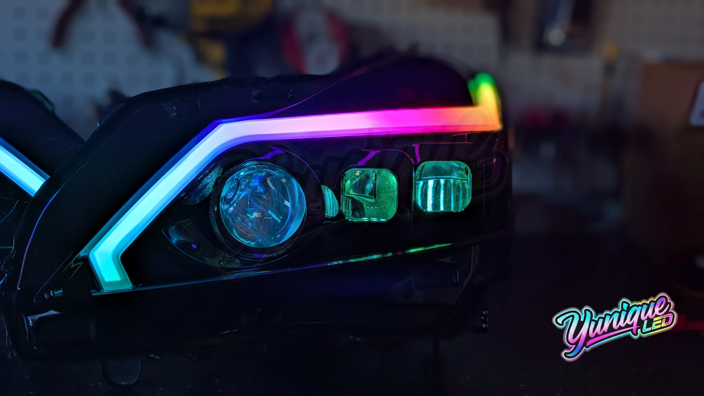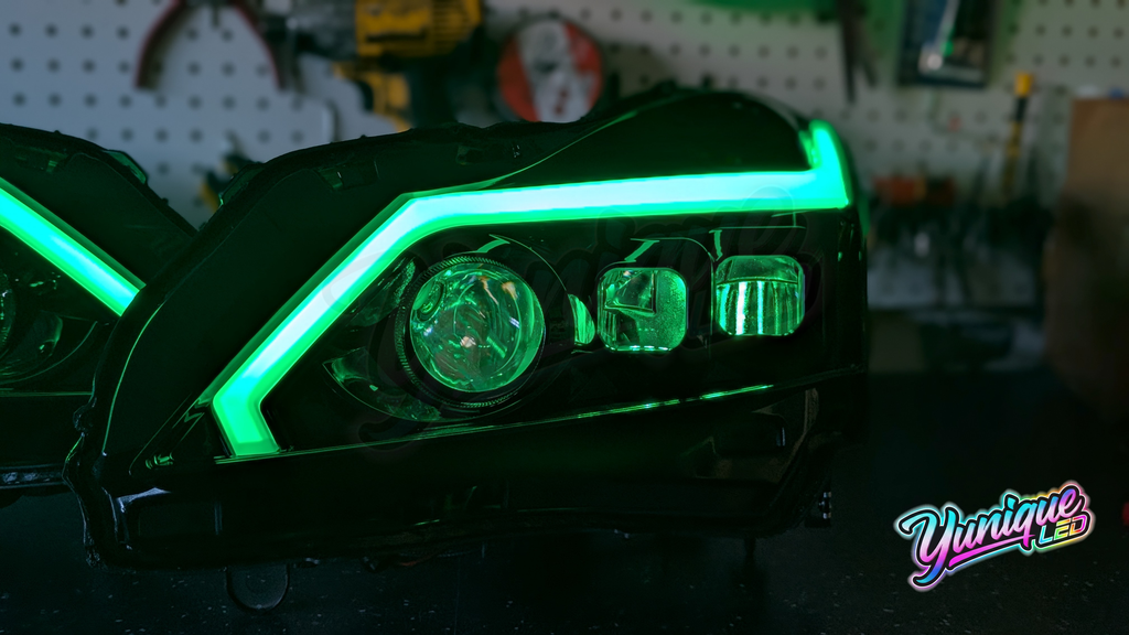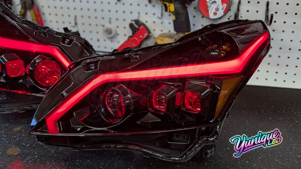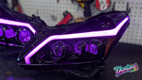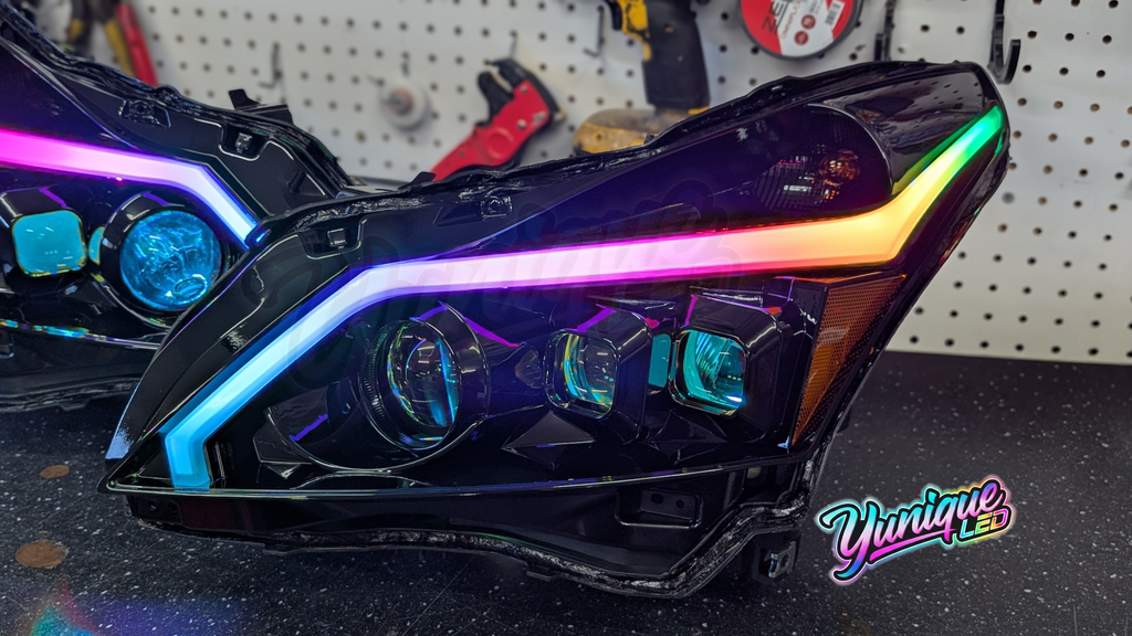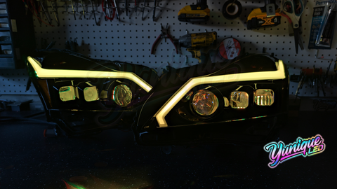 Take your headlights to a whole different level of customization with the blueghozt package! These lights are pre-built and loaded with Sequential multicolor DRLs controlled via a Blueghozt Bluetooth Module installed in brand-new headlights. These lights will have everyone talking about your G. They are guaranteed to make a statement!