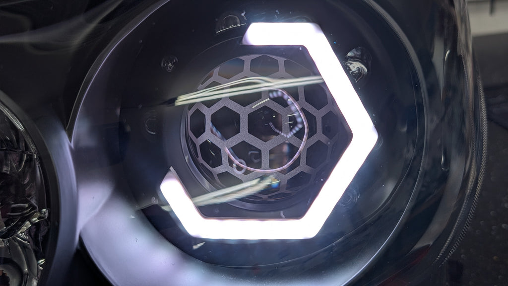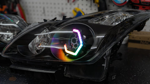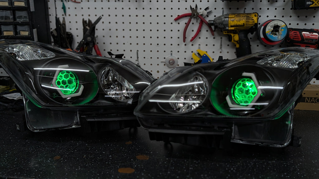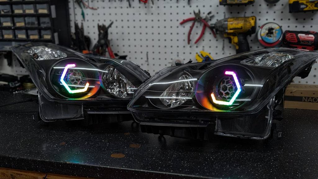 Transform your G37 with a one-of-a-kind, fully custom headlight build designed to stand out day or night. This set blends OEM reliability with modern RGBW lighting, premium etched details, and a stealthy satin black finish. Built in-house with quality components and attention to detail, these headlights are plug-and-play and ready to install, no wait time, no downtime.